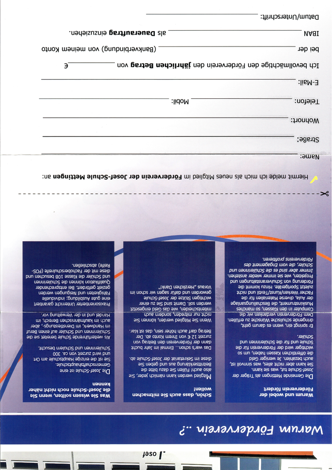 Füllen Sie dazu bitte die Beitrittserklärung aus und geben Sie diese im Sekretariat der Josef-Schule ab. Einmal im Jahr bucht dann der Förderverein den Beitrag von zurzeit 12€ von Ihrem Konto ab. Wenn sie Mitglied werden, können Sie nicht nur mitreden, sondern auch mitentscheiden, wie das Geld eingesetzt werden soll. Damit sind Sie zu einer wichtigen Stütze der Josef-Schule geworden und dafür sagen wir schon im Voraus "Herzlichen Dank!"